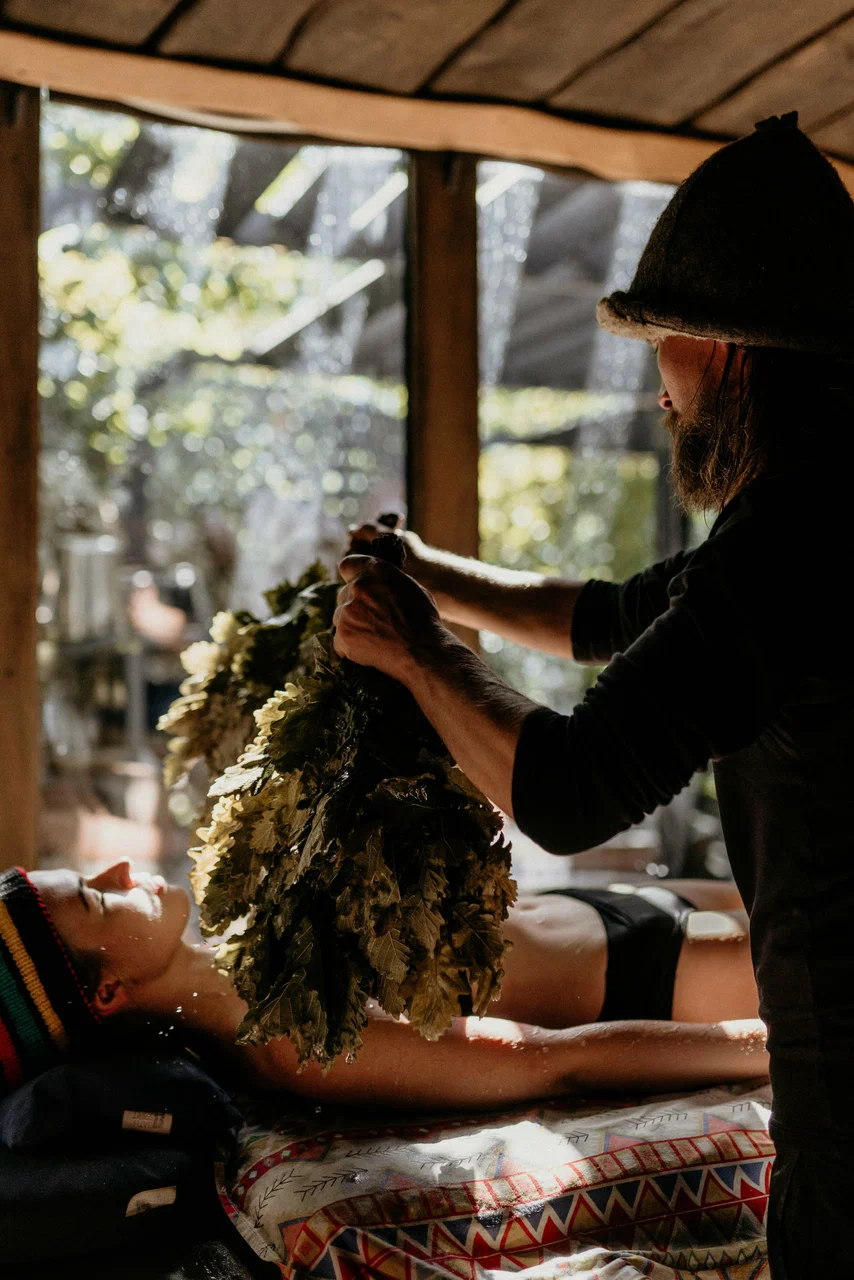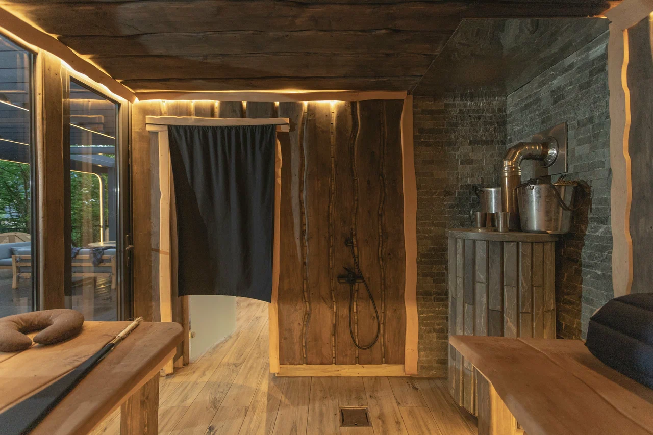 Наша баня — это отдельный ритуал. Дровяная печь, ароматные веники, которые мы собираем сами, и купель с ледяной водой из родника. После парной — травяной чай из трав, собранных на территории заповедника, на веранде с видом на лес. Идеальное завершение дня.